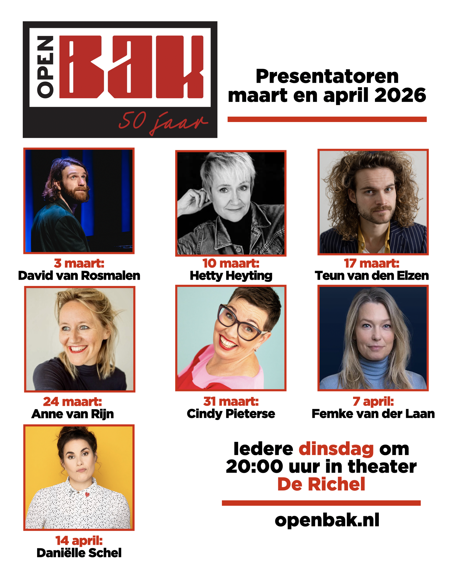 Dit zijn de presentatoren van maart en april 2026. Supertrots dat deze mensen naar de Open Bak komen: David van Rosmalen, Hetty Heyting, Jon van Eerd, Anne van Rijn, Cindy Pieterse, Femke van der laan en Daniëlle Schel.